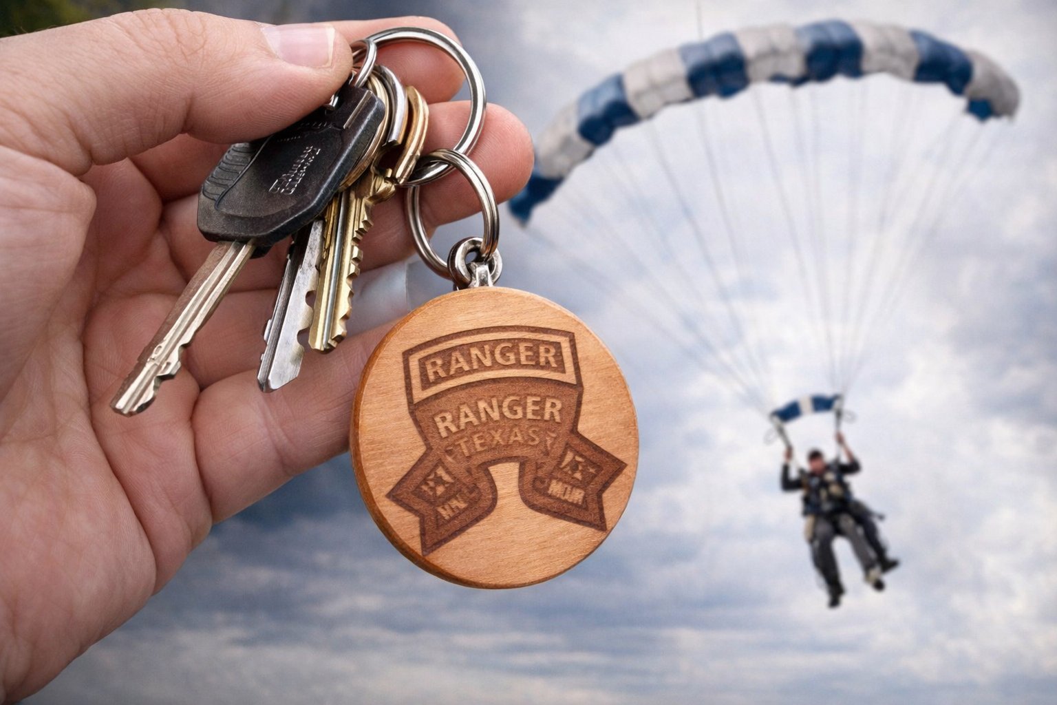 Overall, the keychain has a rugged, patriotic feel, combining a natural wood aesthetic with a Texas Ranger / military-inspired emblem, making it look like a commemorative or pride-themed accessory.