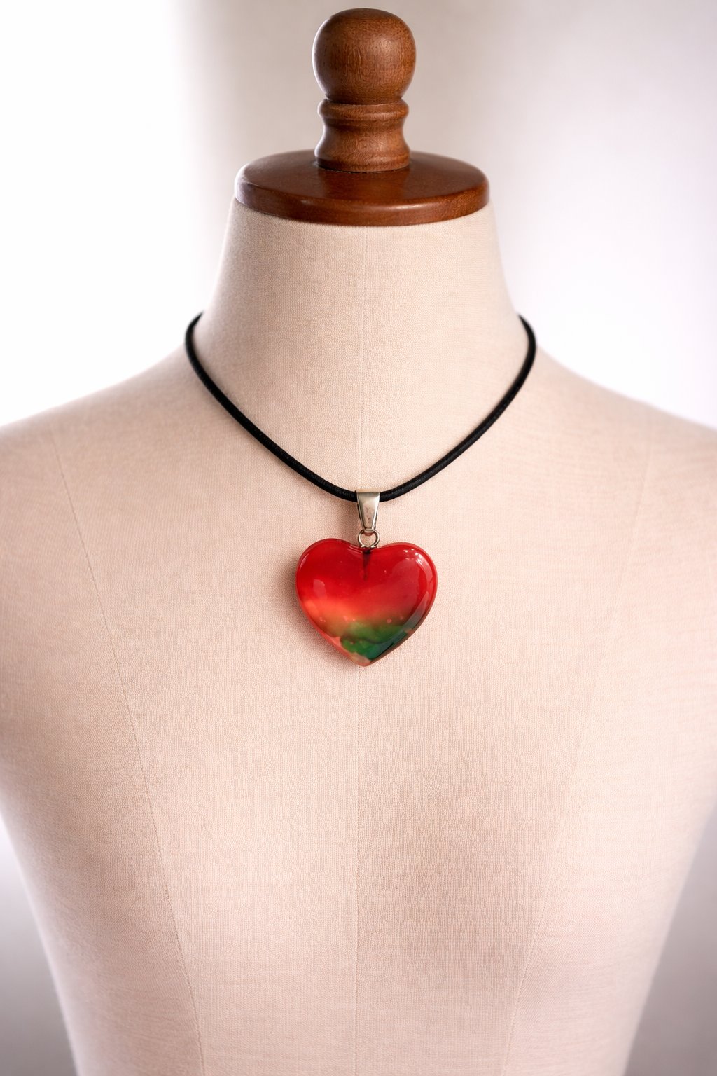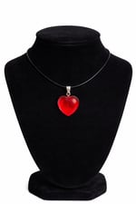 - The black cord blends more with the mannequin, making the heart pendant stand out sharply.