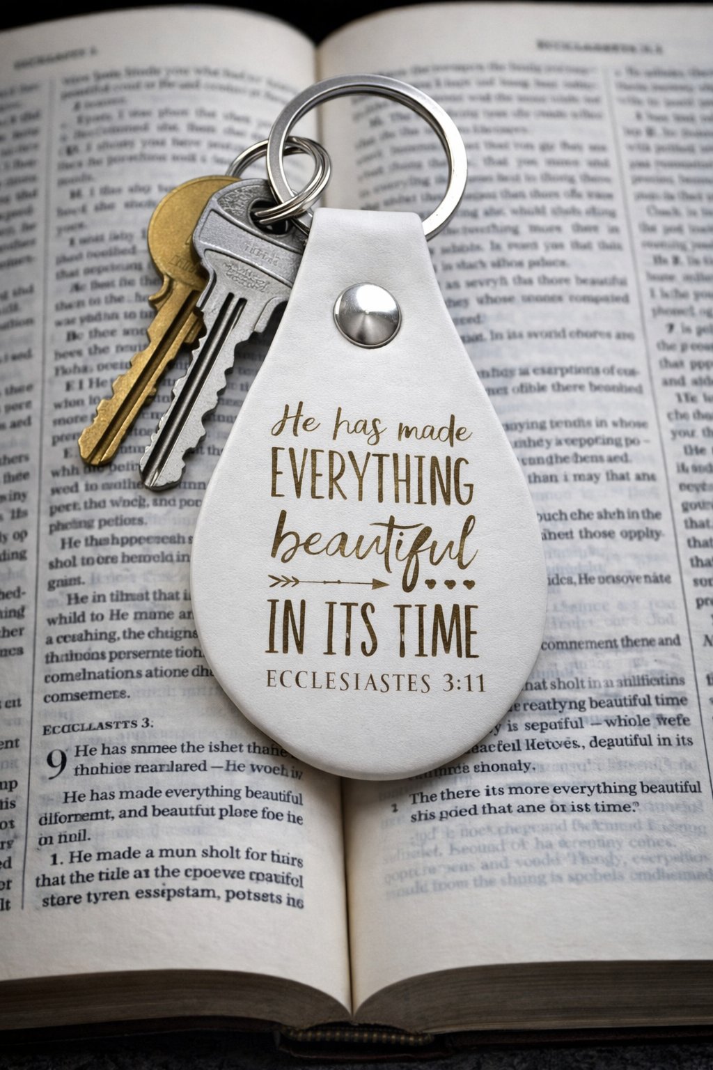 - The keychain feels light, inspirational, and contemporary, blending a soft color palette with a meaningful scripture.