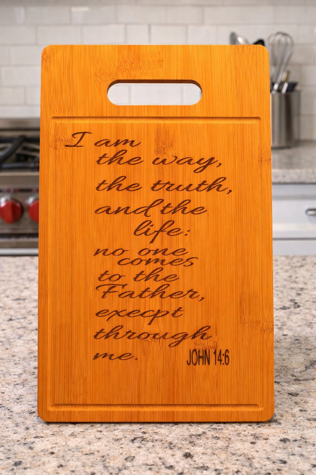 A full-size wooden cutting board, its warm grain and smooth finish giving it a handcrafted, rustic charm. The engraving on the board features a Bible verse written in a flowing cursive script, centered and elegant.