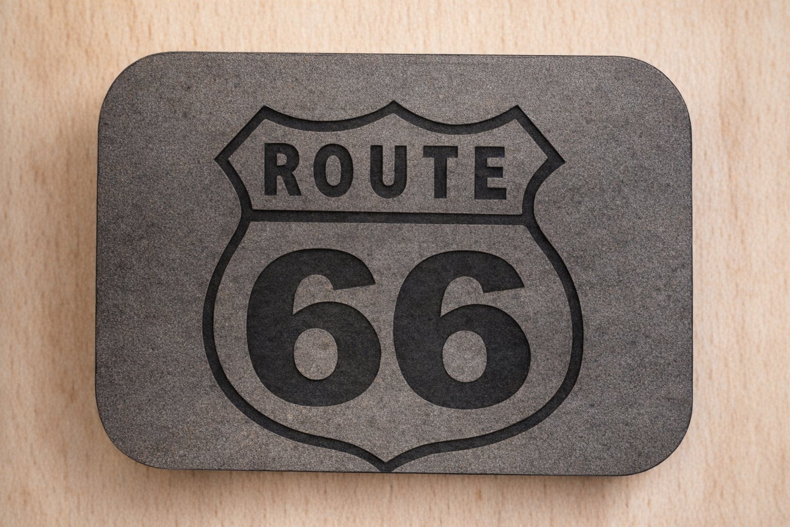The magnet is a dark gray rectangular plaque with softly rounded corners, giving it a smooth, modern look. Centered on its surface is a bold, stylized shield‑shaped emblem—the classic design associated with the historic American highway sign. Inside the shield, the text reads: