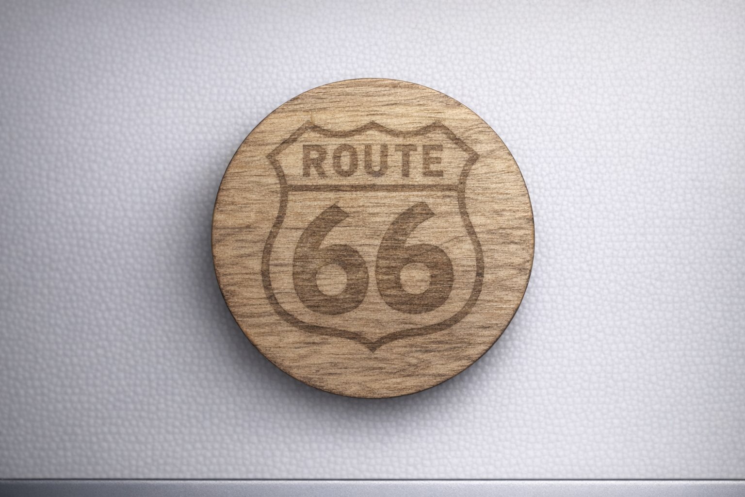 This image features a circular wooden magnet engraved with the iconic Route 66 highway shield. The wood has a warm, natural tone with visible grain, and the engraving is done in a darker shade, creating a strong contrast that highlights the shield’s outline and text.