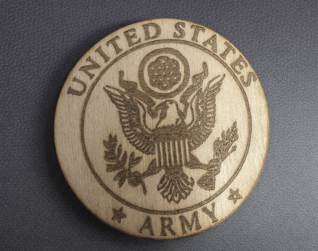 A circular wooden magnet engraved with the Great Seal of the United States, now displayed against a dark gray magnet board. The magnet is crafted from light-toned wood with visible grain and a slightly darker edge, giving it a warm, handcrafted feel.