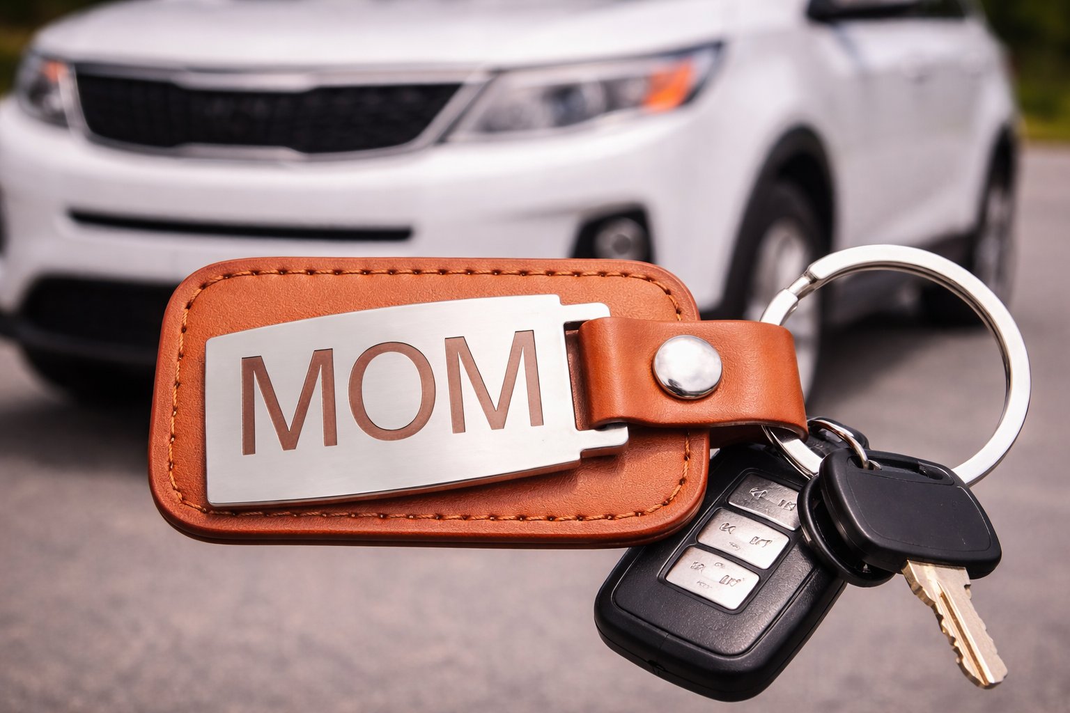 - The blurred car in the background suggests it’s designed for car keys, possibly as a gift for a mom driver.