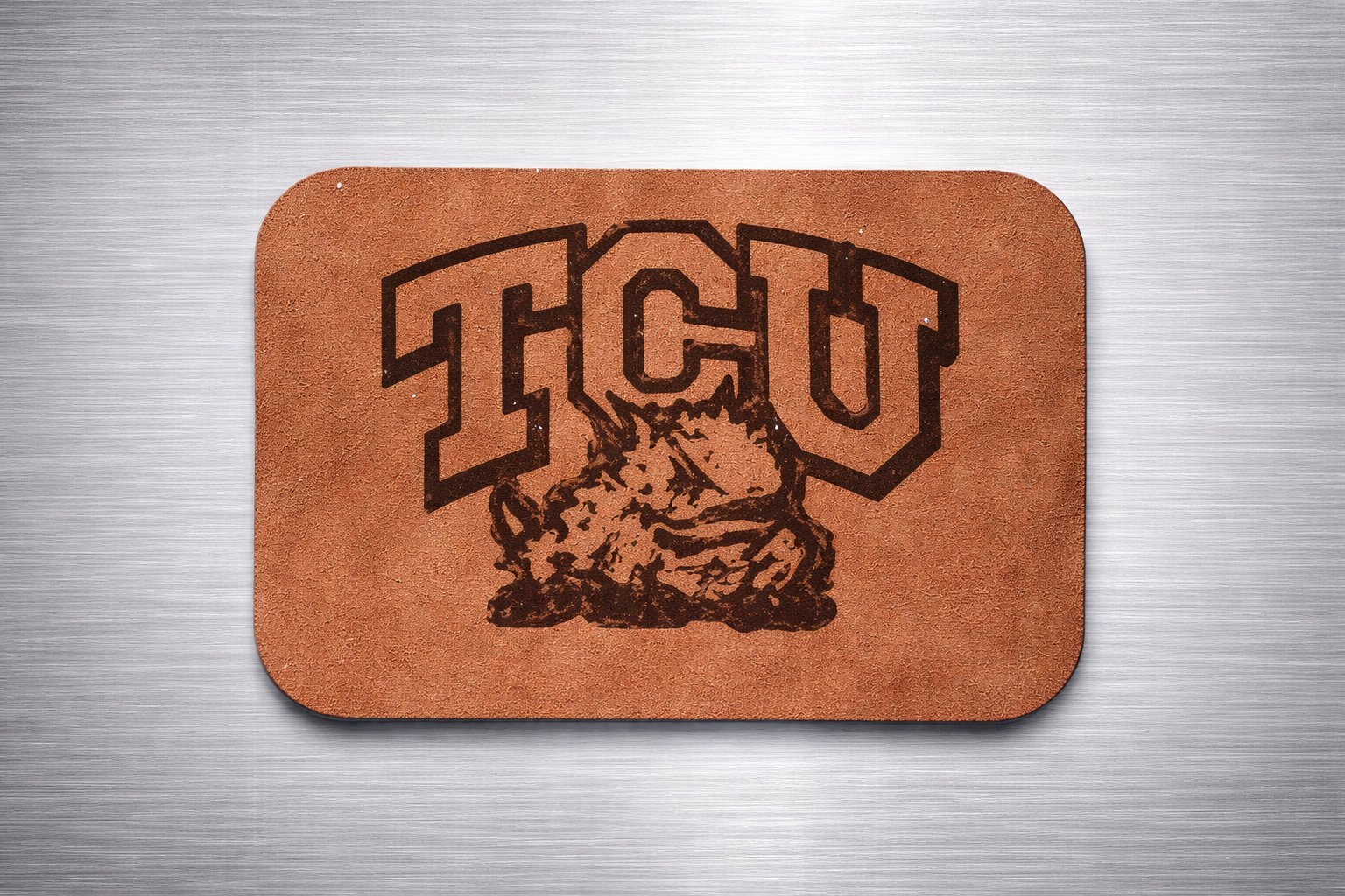 - The top features large, bold “TCU” lettering, engraved deeply into the surface.