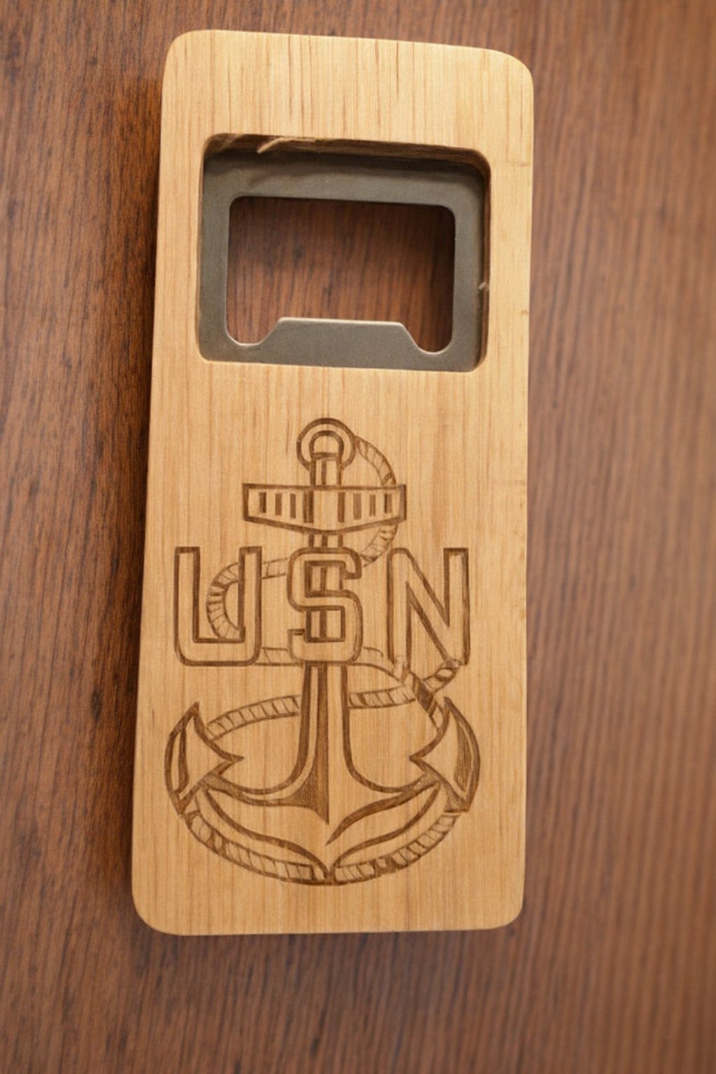 Dominating the wooden face is a bold U.S. Navy–themed engraving. A large anchor stands at the center, its shank straight and confident, its flukes wide and sharply defined. A rope coils around the anchor in a tight, deliberate wrap, adding texture and a sense of maritime tradition. Running vertically down the center are the letters USN, each one deeply etched, crisp, and darkened to emphasize contrast. The engraving feels ceremonial—like something meant to honor service, discipline, and the sea.