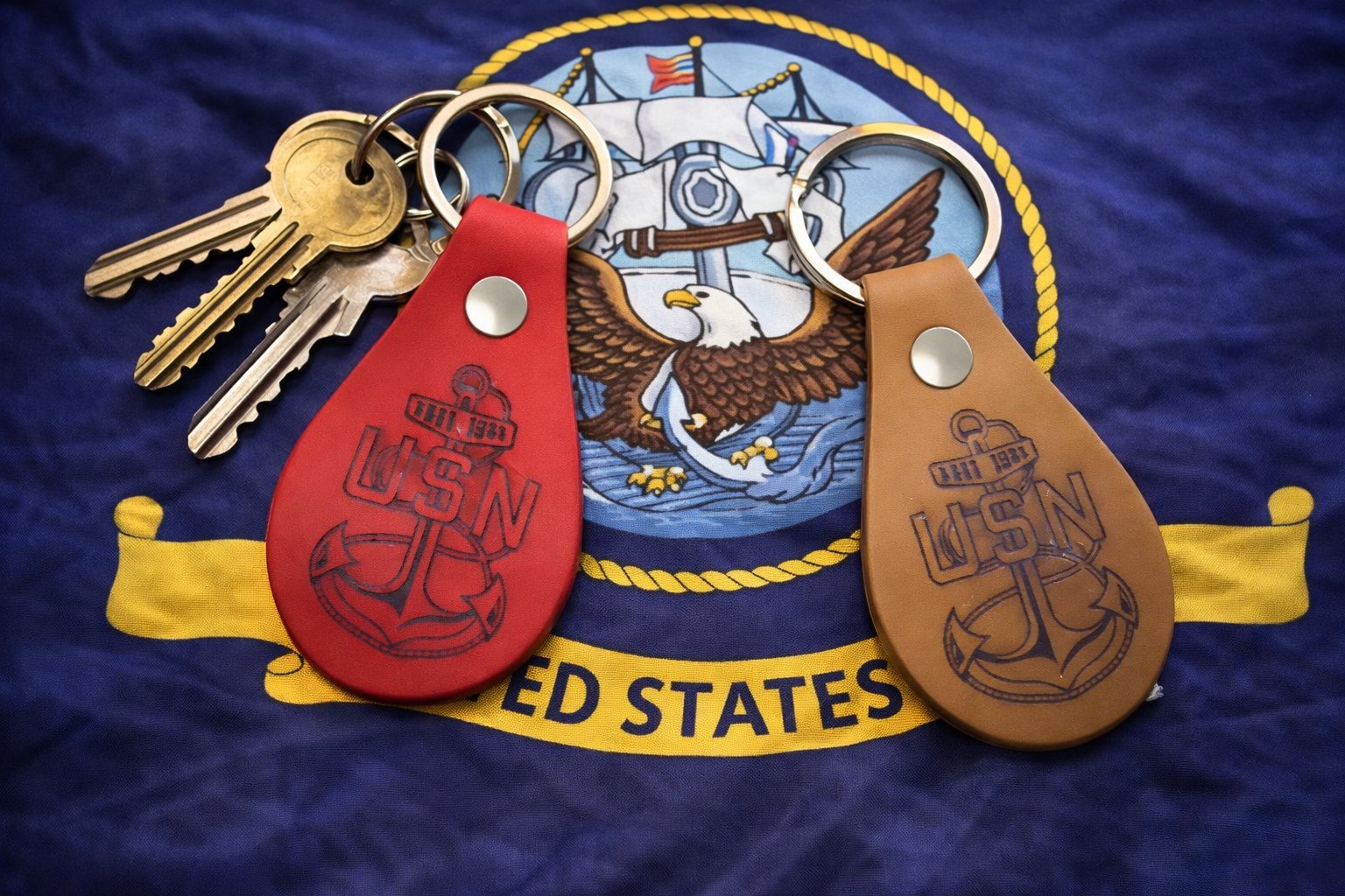 These keychains have a nautical, military-inspired design representing the U.S. Navy: