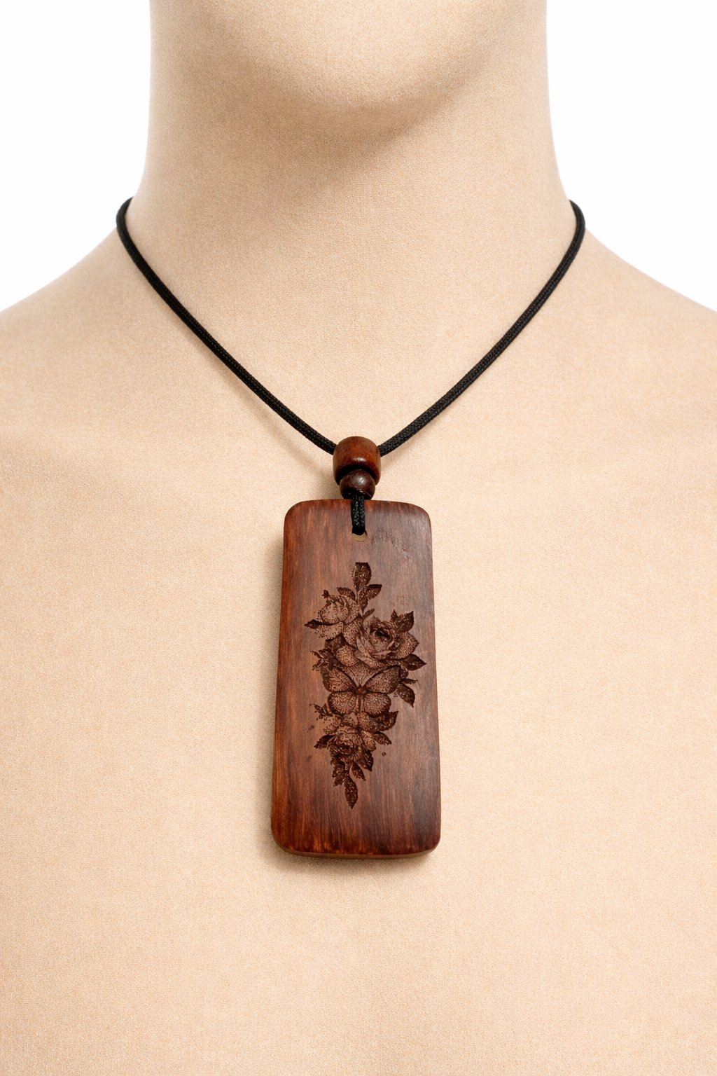 The pendant is smooth, with rounded edges, and features a detailed engraved floral design— roses and a butterfly —running vertically down the center. There is also a small wooden bead above the pendant where it connects to the cord.