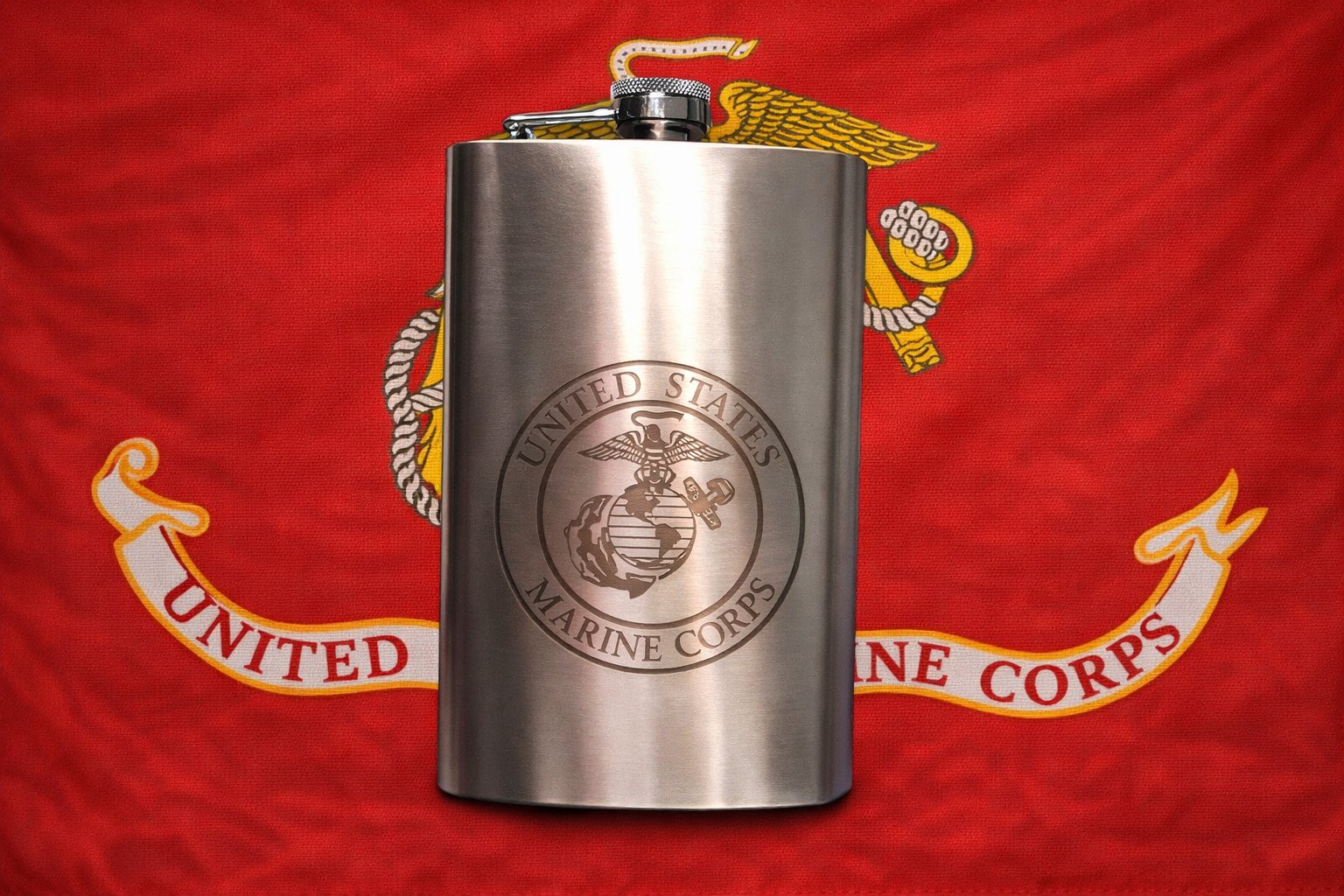 The lighting highlights the reflective metal surface, giving the flask a clean, polished look, while the red flag backdrop creates a strong, patriotic contrast that draws attention to the engraving.